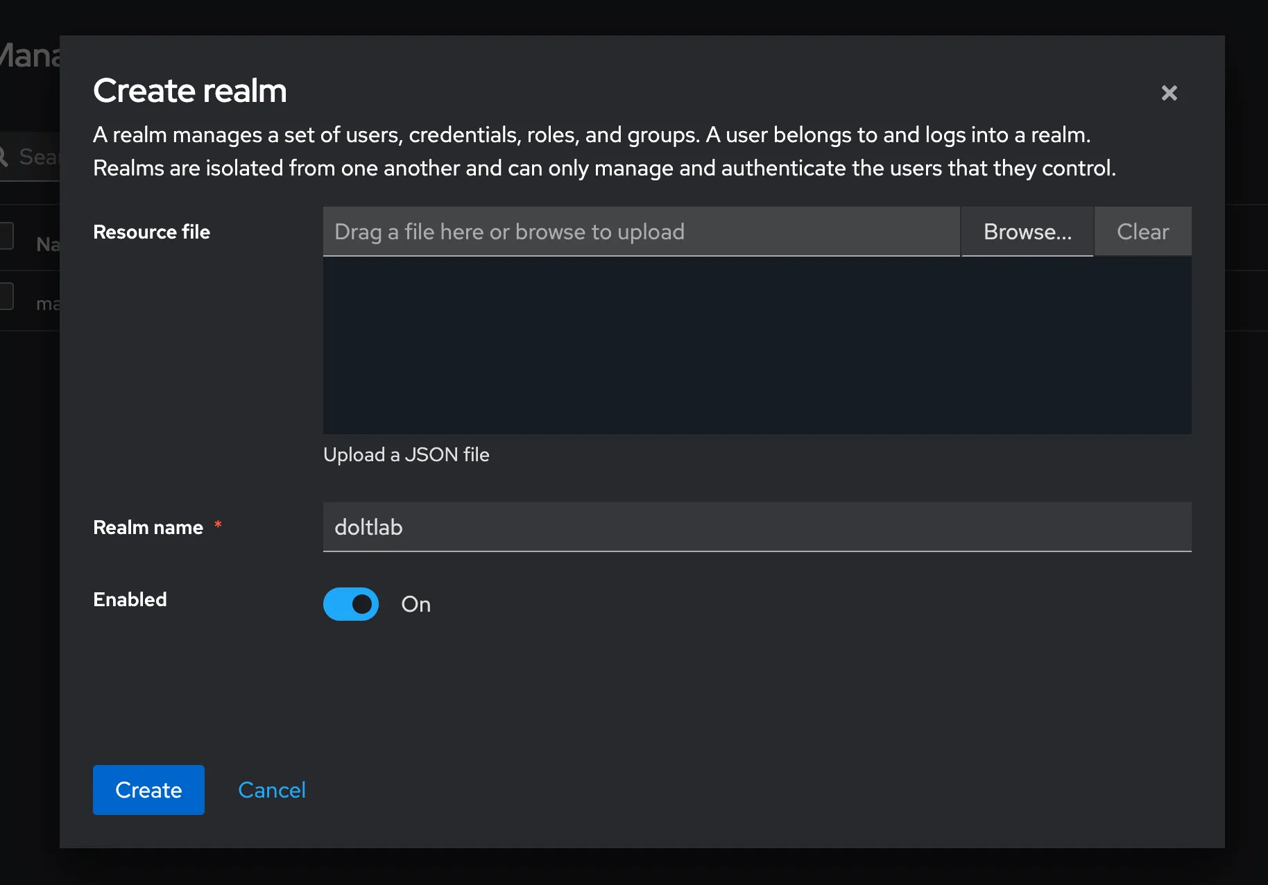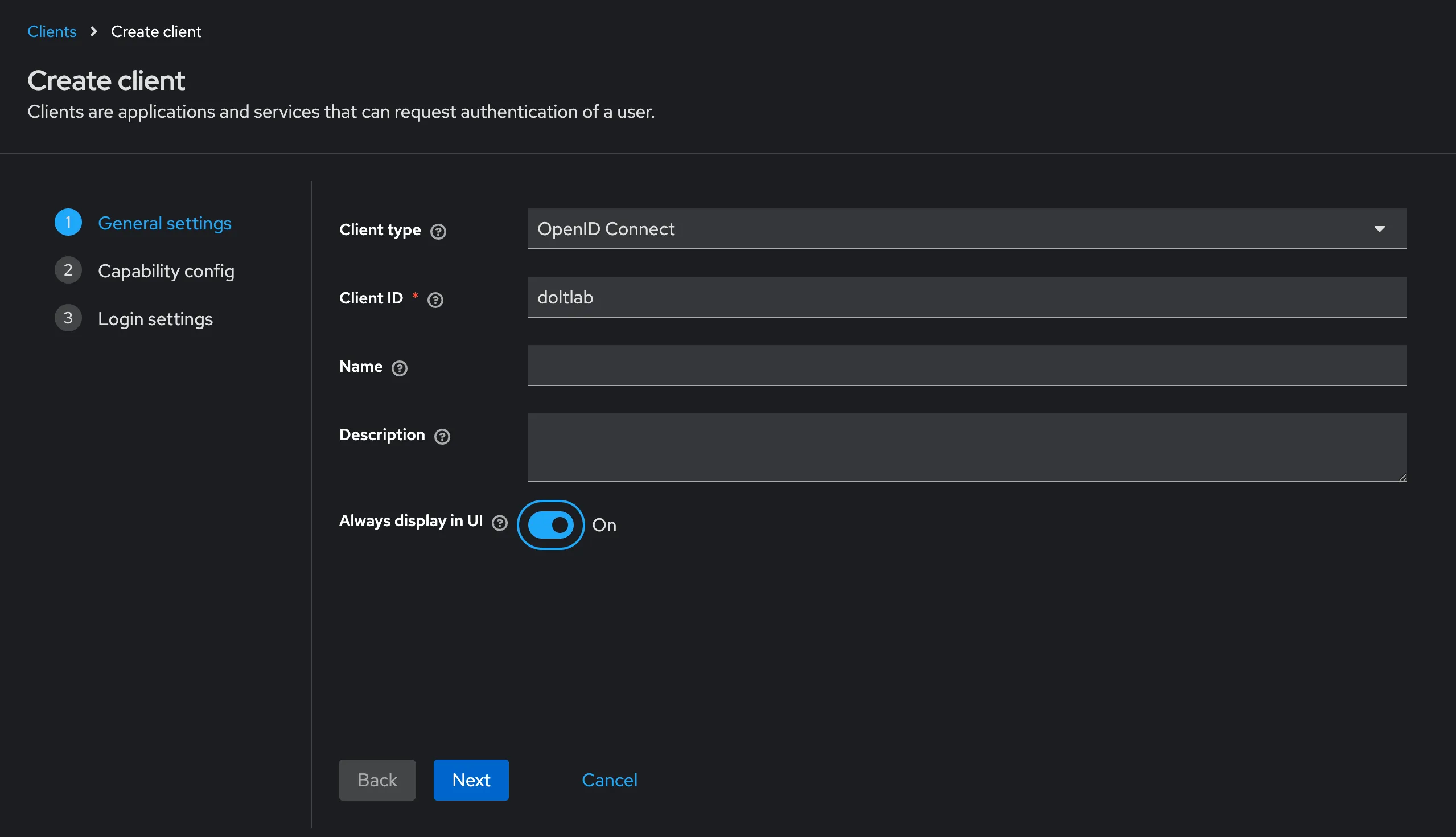 Looking at the images above, you’ll see we’ve created a realm called doltlab. Once the new realm is created, this will be set as our “current realm”, where we’ll create our OIDC client.