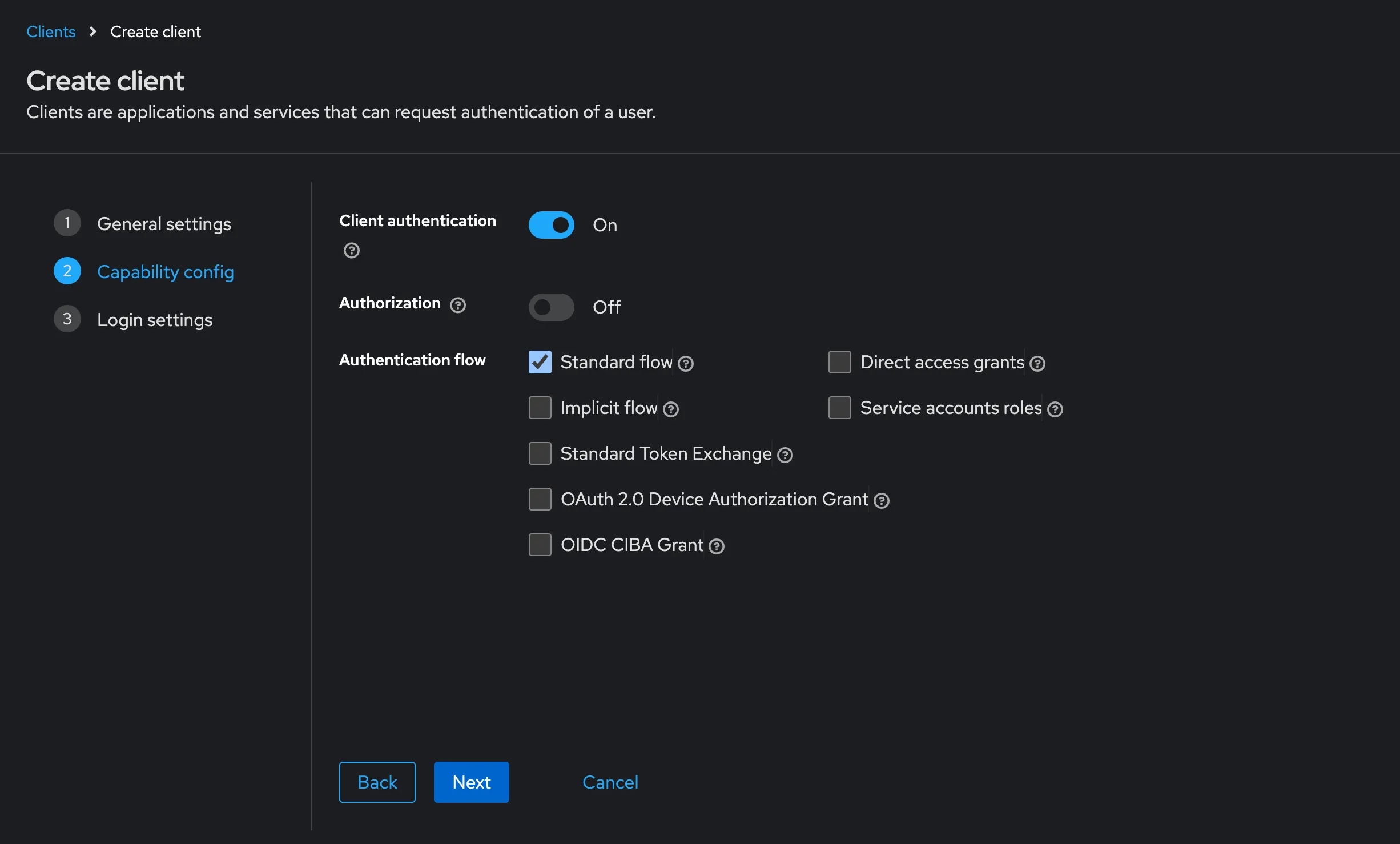 We click on the Client tab next, then proceed to create the OIDC client by filling out the “Create Client” forms, there are three. While doing so, it is important that we make sure to also select the “Standard Flow” checkbox option and enable Client Authentication at form number two.