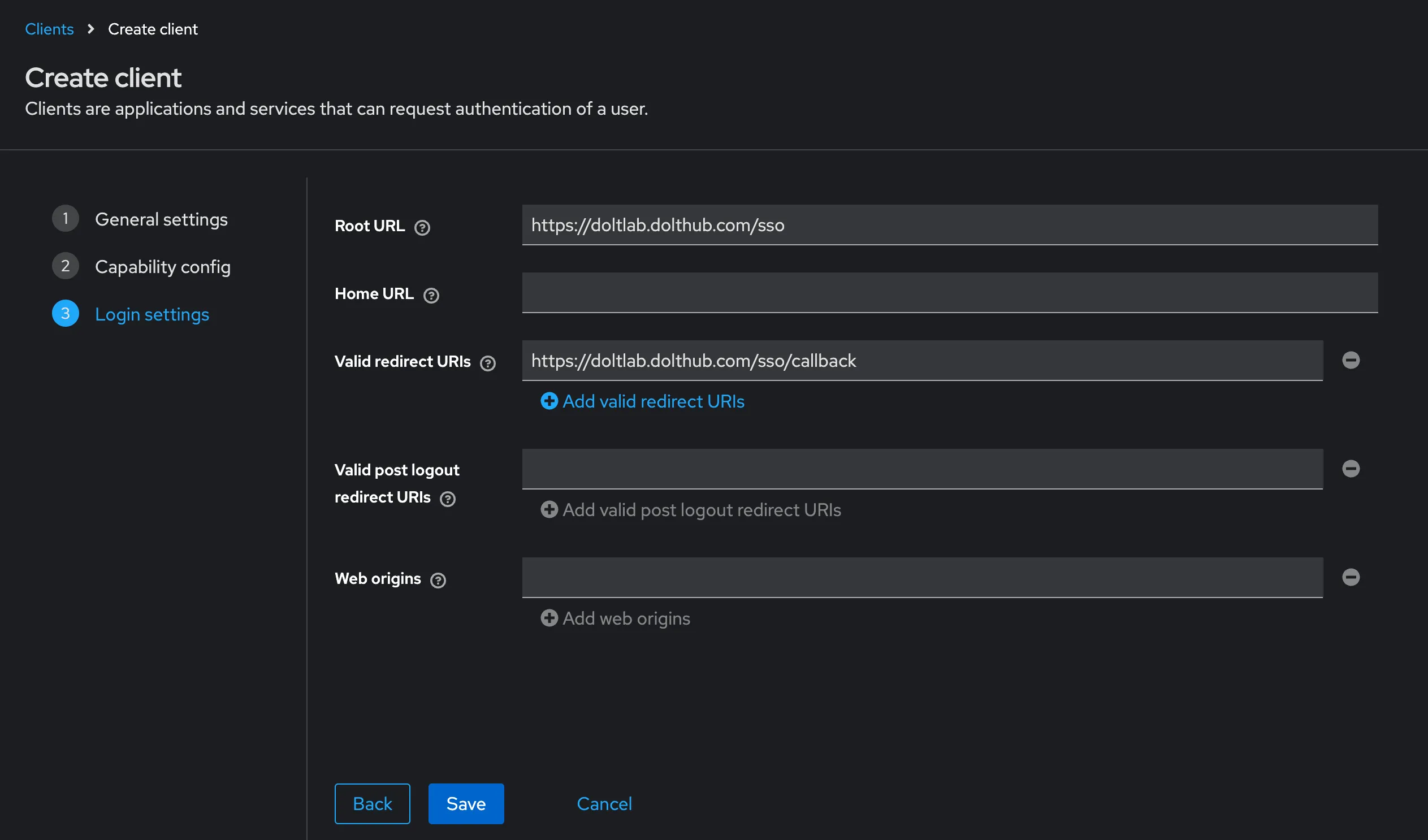 For the “Redirect url” field, which tells Keycloak where to redirect the user after they’ve successfully signed in, we’ll do the same thing we did for “Root url” only this time using the special path DoltLab Enterprise uses for SSO redirection, /sso/callback.