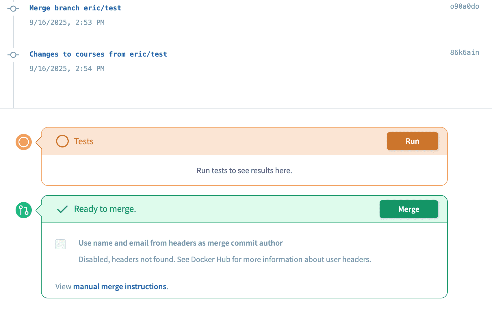 A common use case for the Dolt test framework is to execute your tests on a branch before merging in order to validate any changes. To make this process more seamless, we added a component that allows you to run tests before performing a merge from the workbench. If you have tests defined on your branch, you'll see the following section above the Merge option: