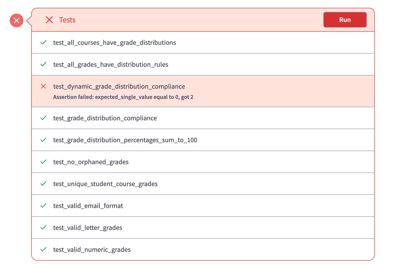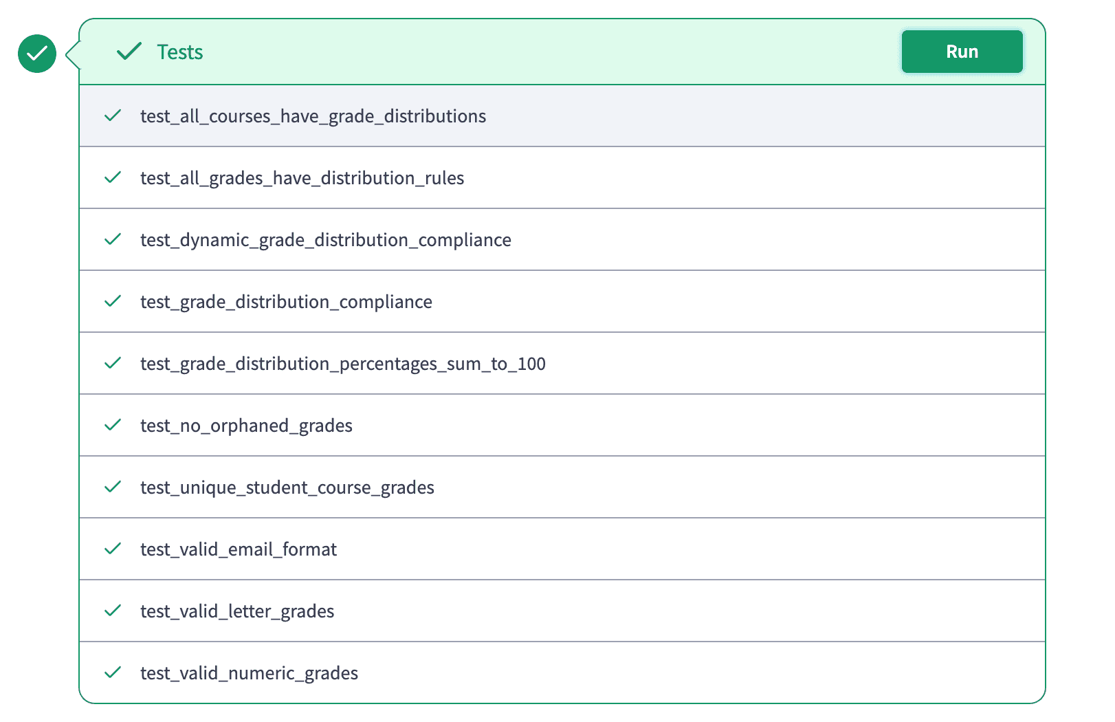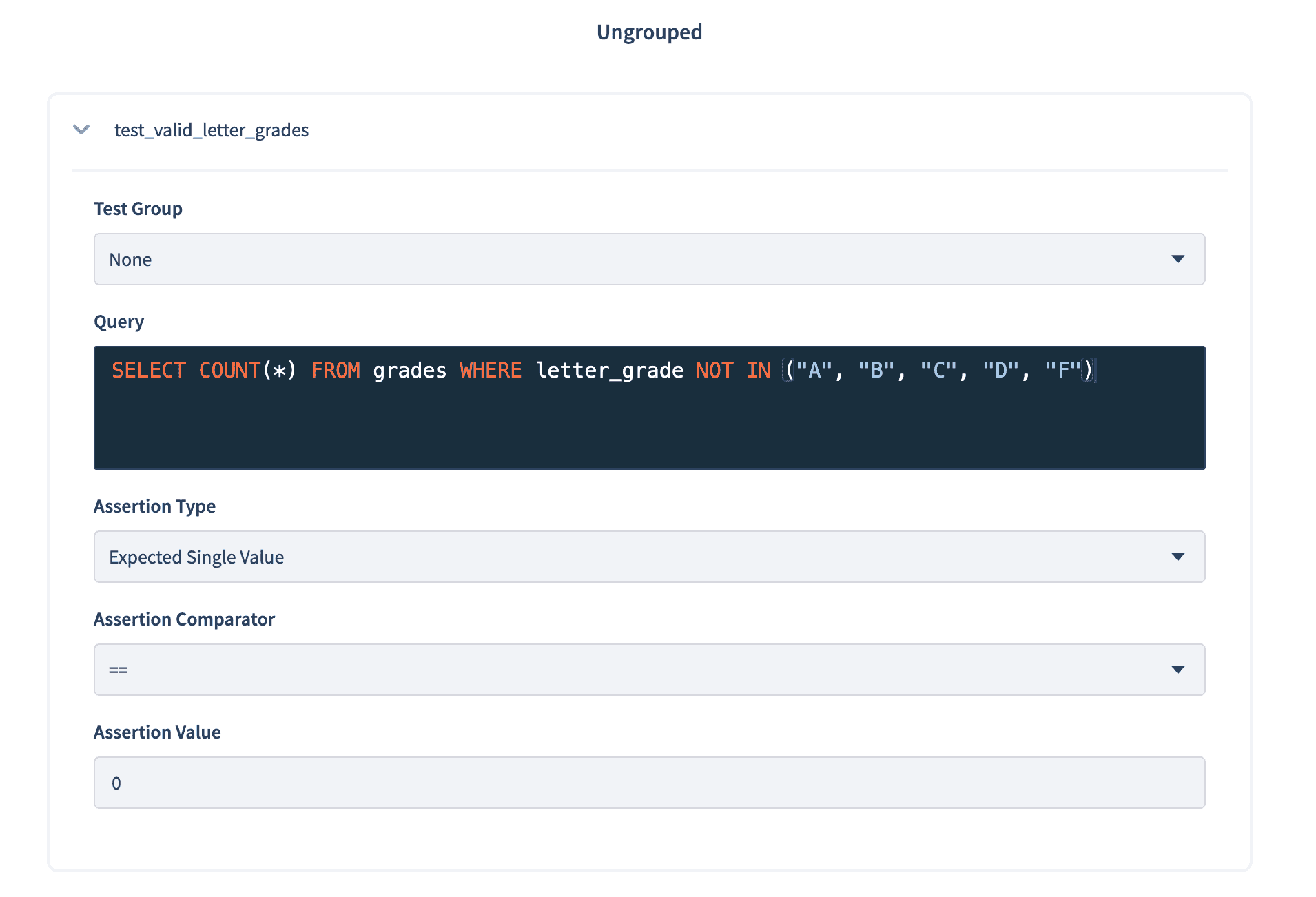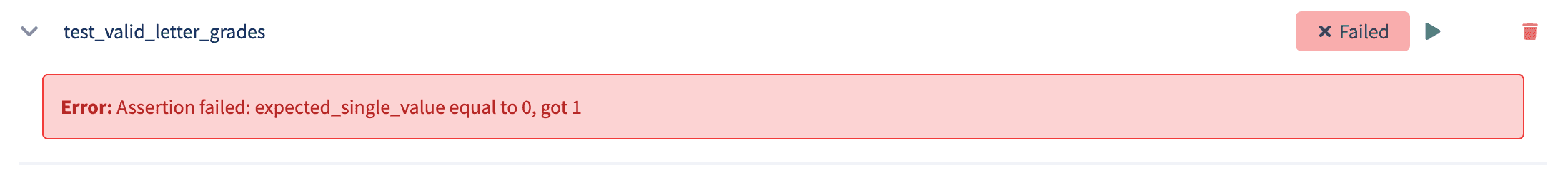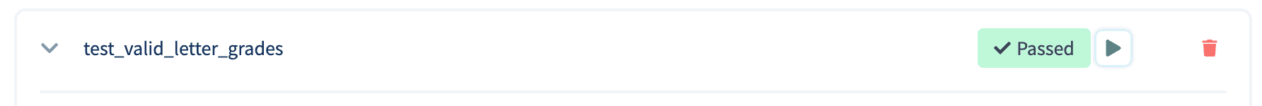 Great, the test passed! To illustrate the failing case, I'll run the following query, which will assign the letter grade E