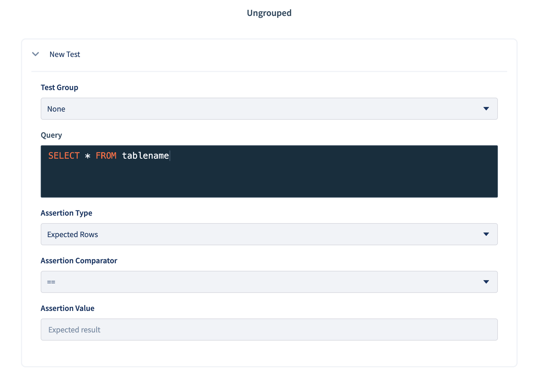 This will create a blank test with some default values. Notice that the new test appears underneath the "Ungrouped" header. This is used to distinguish between tests that are assigned to a test group and those that are not. Since we haven't created a test group yet, our test falls into the "Ungrouped" category.